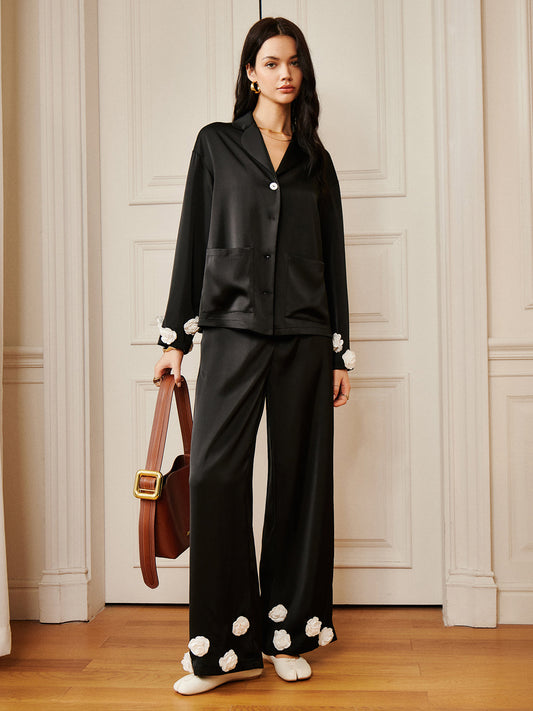 3D Flower Solid Long Sleeve Top & High Waist Pants Set