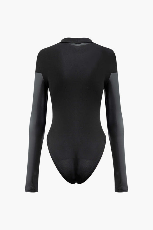 Black Mock Neck Faux Leather Paneled Long Sleeve Bodysuit