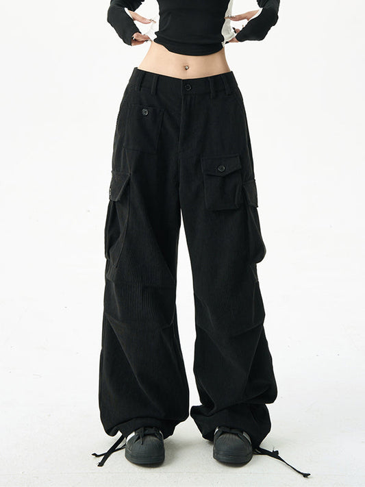 Black Vintage Corduroy Cargo Pants with Multi Pockets