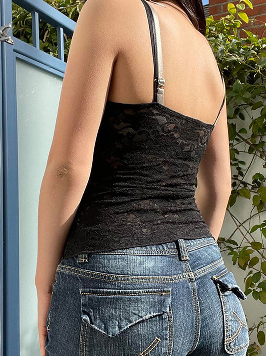 Black Vintage Lace Paneling Black Slim Fit Cami Top