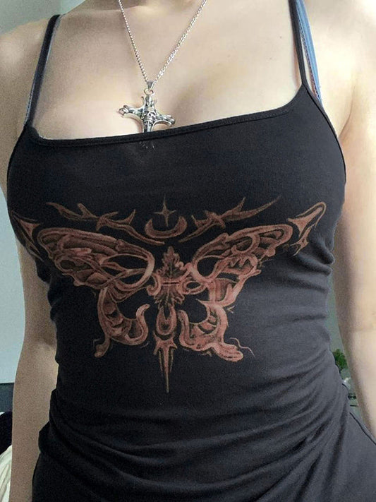 Black Y2K Butterfly Print Slim Fit Black Cami Top
