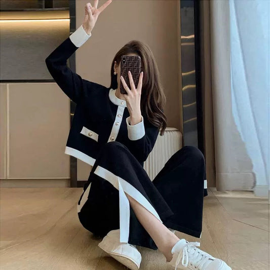 Black – Cardigan Top & Wide-Leg Pants Two Piece Set