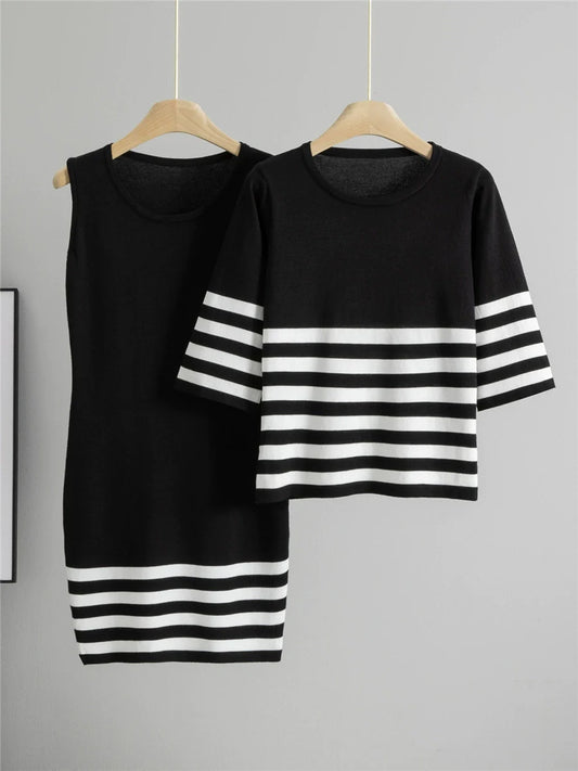 Black – V-Neck Short Sleeve Striped Two Piece Set