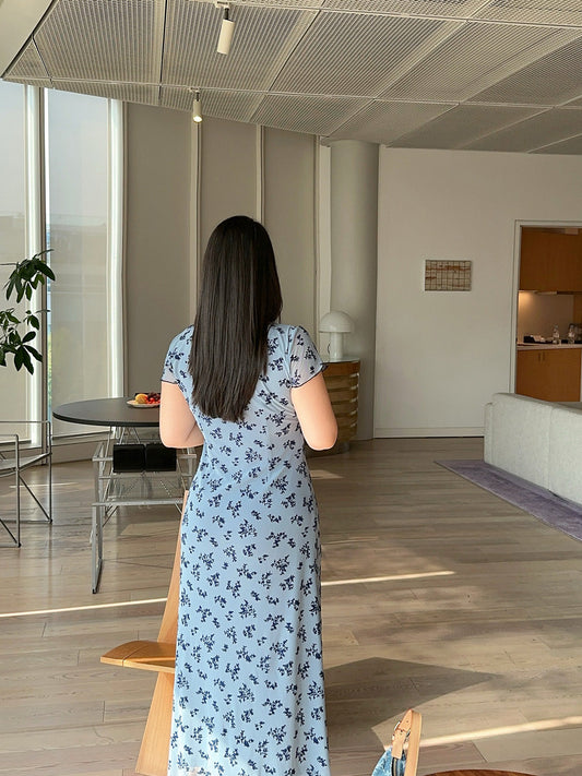 Blue Floral Puff Sleeve Babydoll Mini Dress