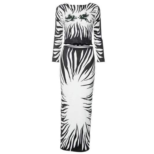 Abstract long sleeve contrast backless self tie maxi skirt set