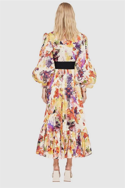 Abstract Print Lantern Sleeve Midi Dress With Belt