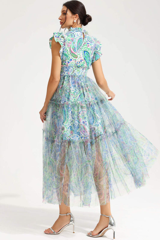 Abstract Print Flutter Sleeve Crew Collar Midi Dress