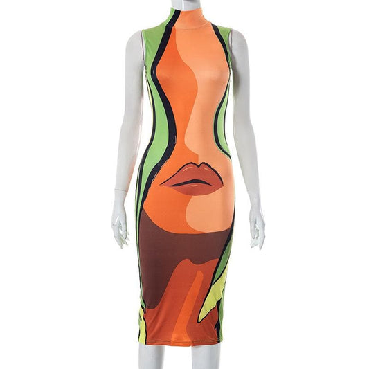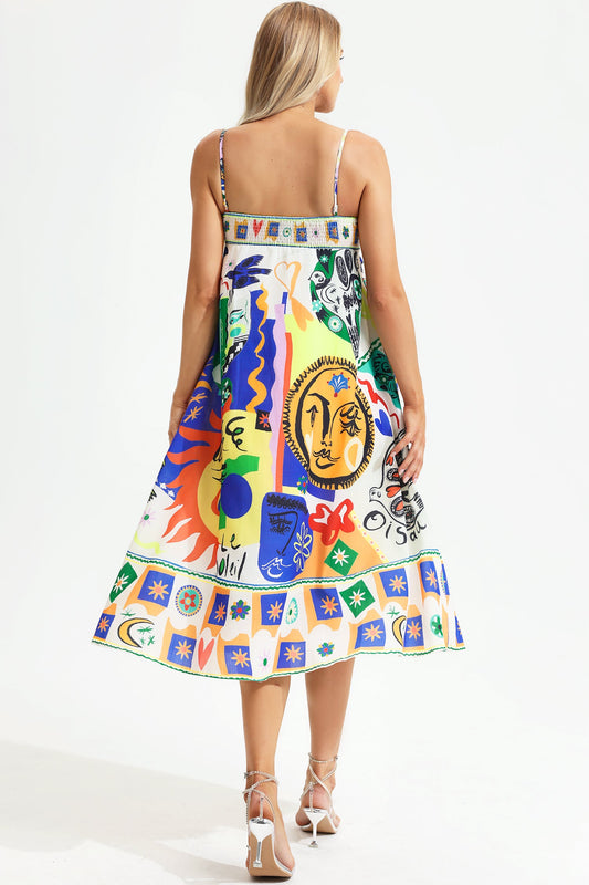 Abstract Print V-Neck Sleeveless Backless Midi Dress