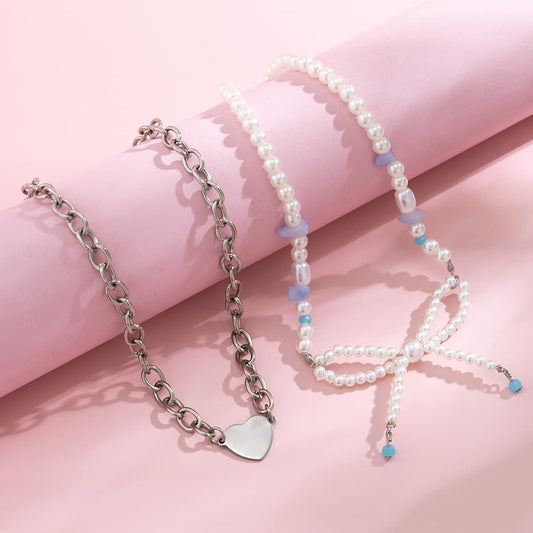 Bowknot faux pearl beaded 2 pcs chain necklace