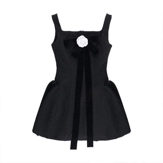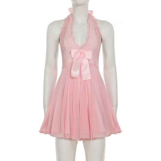 Bowknot contrast halter fluffy gloves backless mini dress-final-sale