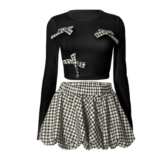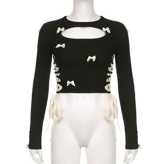 Bowknot long sleeve hollow out lace up contrast cut out top