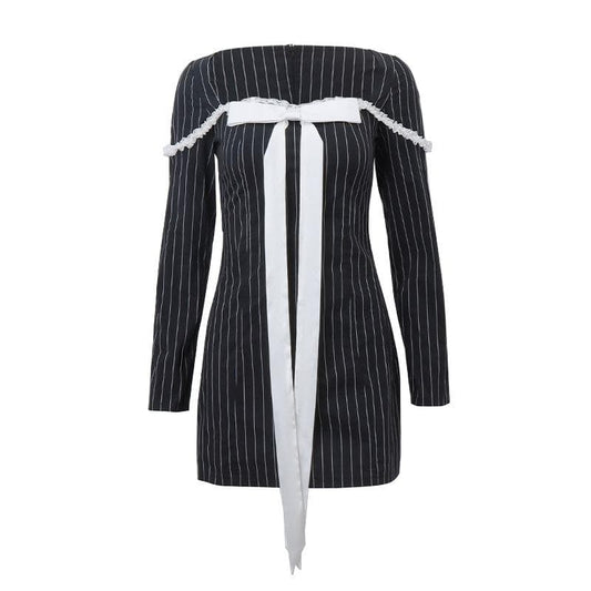 Bowknot striped long sleeve square neck zip-up contrast mini dress