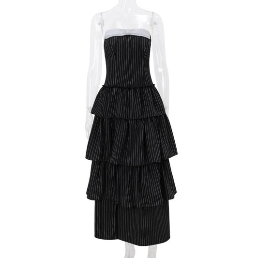 Bowknot ruffle striped high slit tube maxi dress