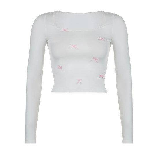 Bowknot square neck long sleeve contrast top