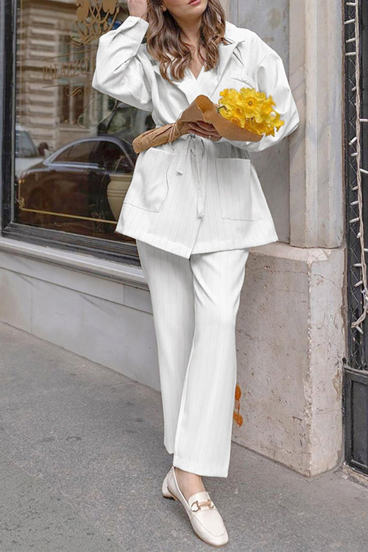 British Style Elegant Striped Bandage Turn-back Collar Long Sleeve Two Pieces