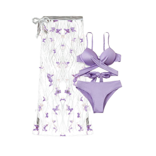 Butterfly applique mesh self tie contrast cross front cami 3 piece swimwear