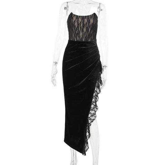 Bustier ruched smocked slit velvet lace irregular tube midi dress