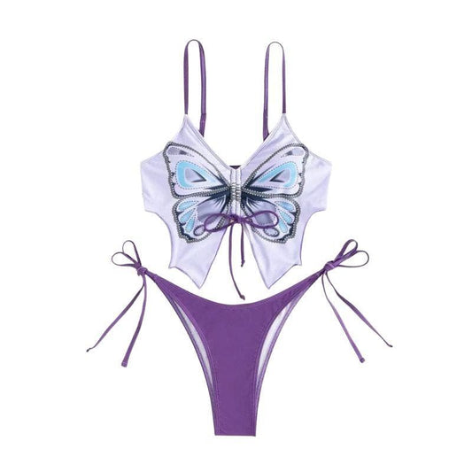 Butterfly pattern drawstring contrast self tie cami bikini swimwear
