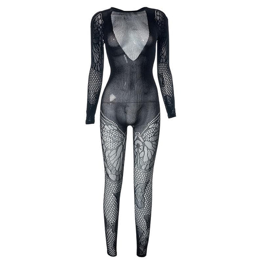 Butterfly pattern fishnet long sleeve solid jumpsuit