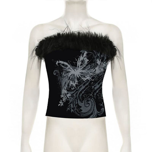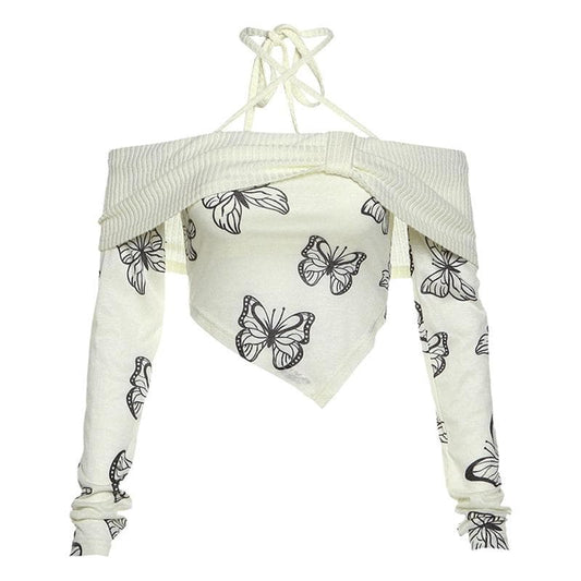Butterfly print contrast off shoulder halter long sleeve crop top