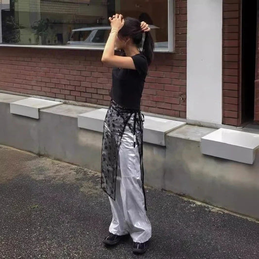 Aesthetic See Through Sequins Flower Lace Long Apron Skirt