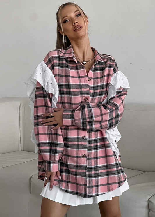 Ainsley Plaid Poplin Shirt - Pink Ruffle Accent Button-Up