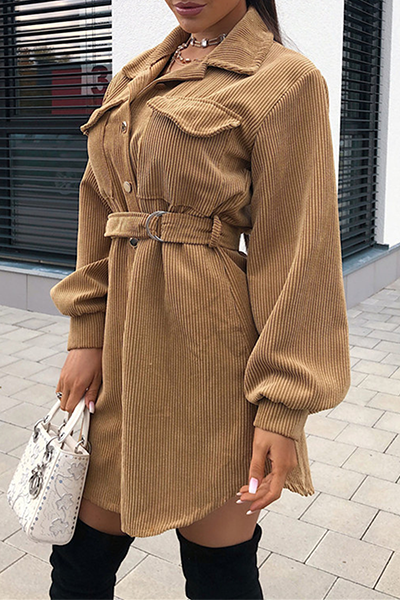 Fashion British Style Solid Pocket Buckle With Belt Turndown Collar Dresses