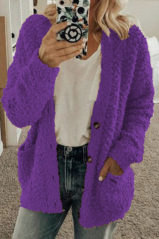 Fashion Casual Geometric Patchwork Buckle V Neck Outerwear Mock Pocket Sweater