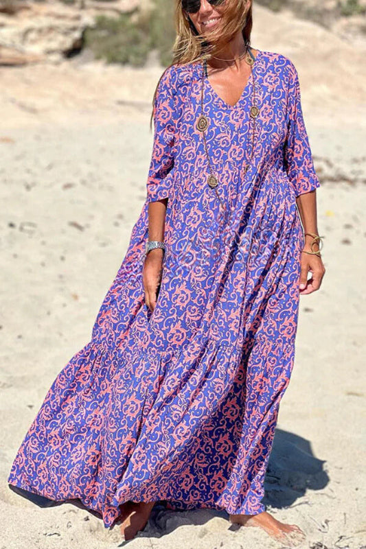 Fashion Pattern Printed Half Sleeve Loose Swing Maxi Dresse