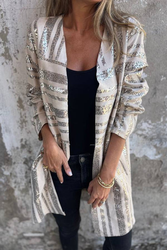 Fashionable Gold Foil Leopard Print Suede Long Sleeve Loose Pocket Midi Coat