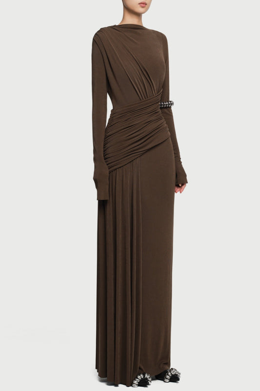 Fiada Draped Long Sleeve Maxi Dress - Brown