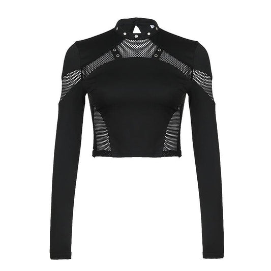 Fishnet patchwork solid button long sleeve crop top