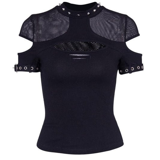 Fishnet patchwork hollow out short sleeve buckle cut out top