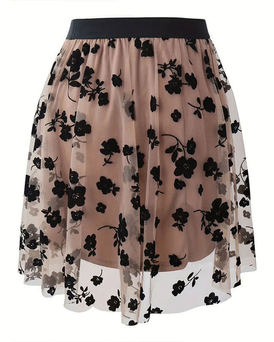 Flocking Flower Bird Tulle Gauze Elastic Waist Midi Skirt
