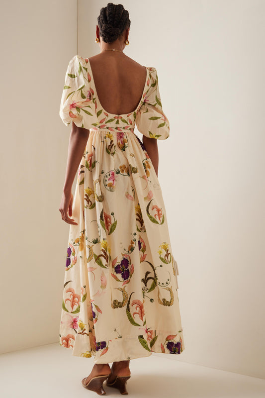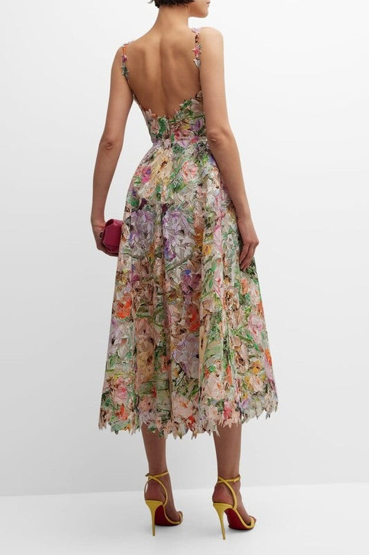 Floral Embroidery Puff Sleeve Square Collar Midi Dress