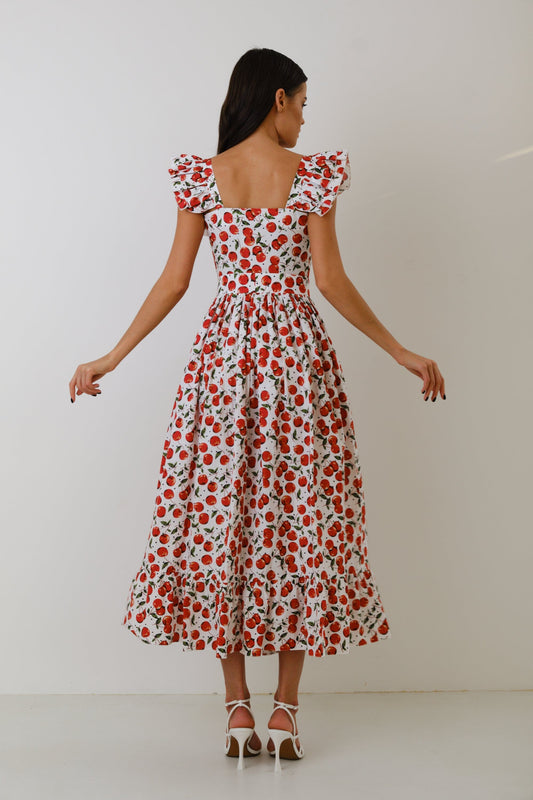Floral Frill Puff Sleeve Sweetheart Neck Maxi Dress