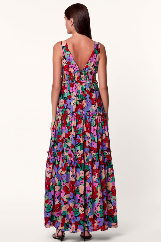 Floral Frill V-Neck Sleeveless Smocking Maxi Dress