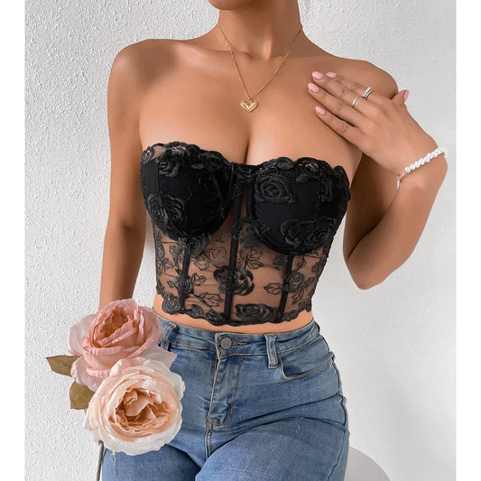 Floral Lace Bandeau Strapless Crop Top