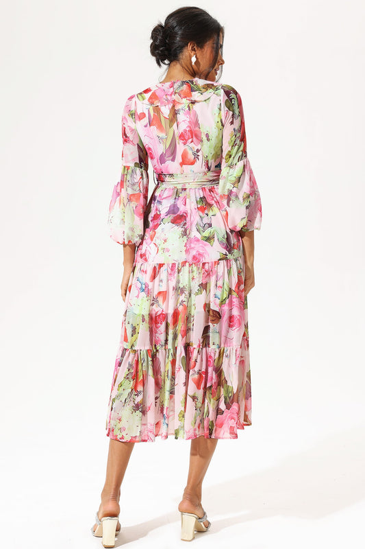Floral Long Sleeve Ruffle Hem Maxi Dress Pink