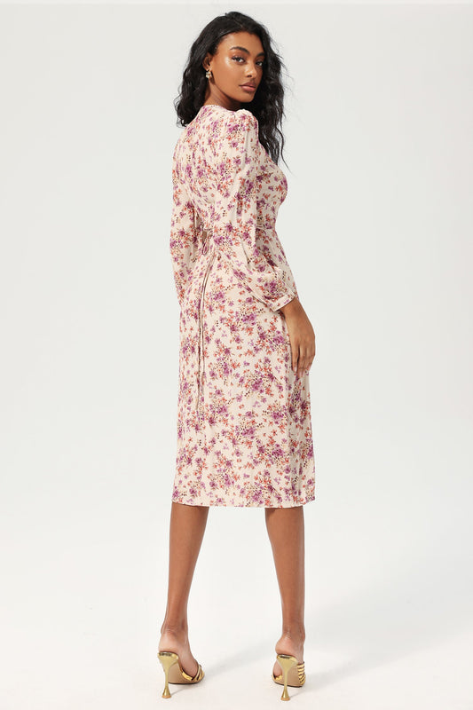 Floral Long Sleeve V-Neck Lace Up Midi Dress