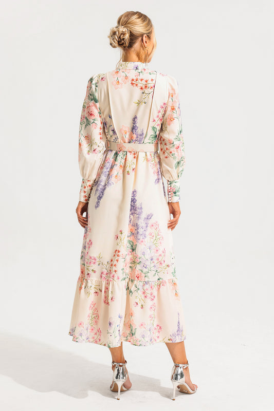 Floral Long Sleeve V-Neck Midi Dress With Belt