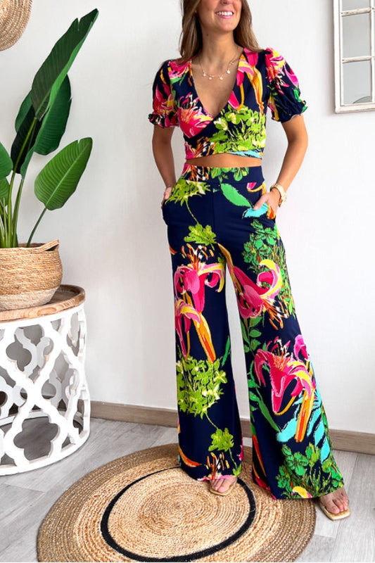 Floral Print V Neck Short Sleeves Crop Top Elastic Waist Wide Leg Pants Set