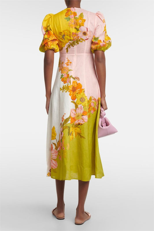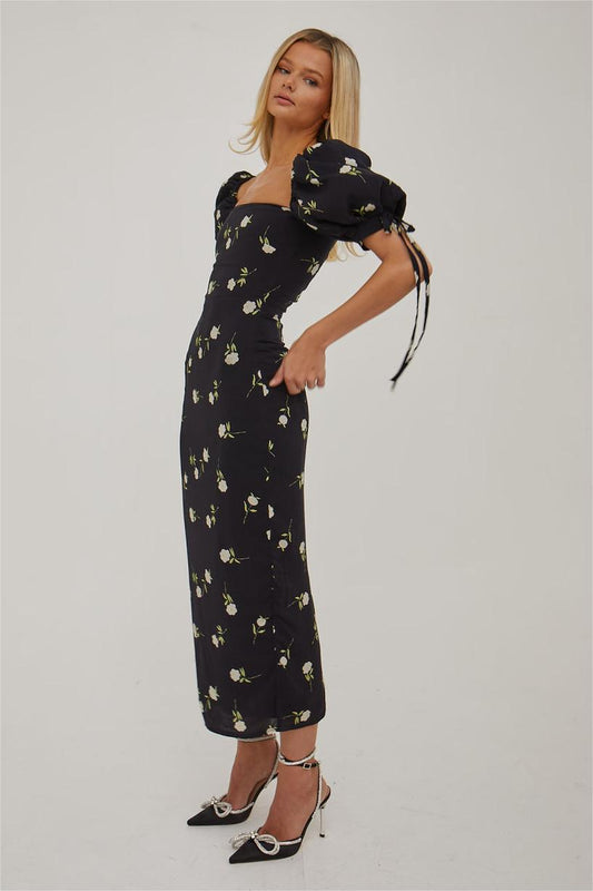 Floral Puff Sleeve Square Collar Slit Midi Dress
