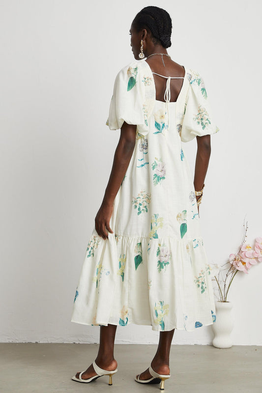 Floral Puff Sleeve Lace Up Frill Midi Dress
