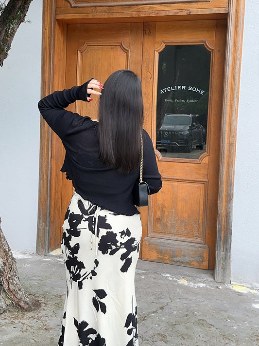 Floral Satin Slit Midi Skirt