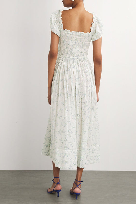 Floral Square Collar Lantern Sleeve Tapered Waist Midi Dress