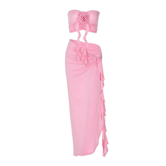 Flower applique solid ruffle irregular backless tube mini skirt set
