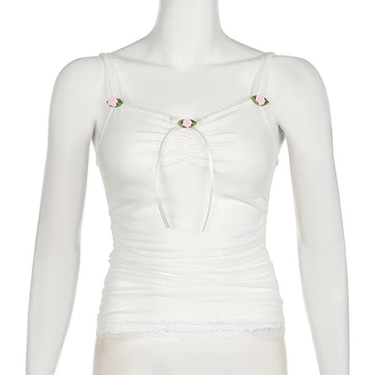 Flower applique ribbon ruched lace hem cami top
