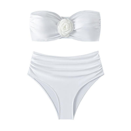 Flower applique ruched tube solid bikini swimwear