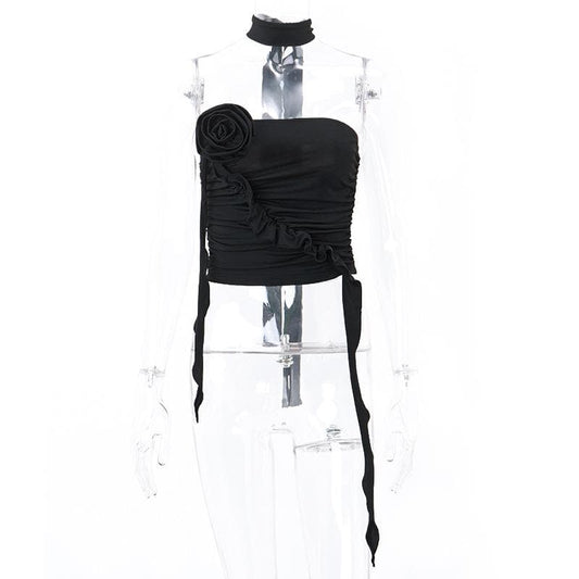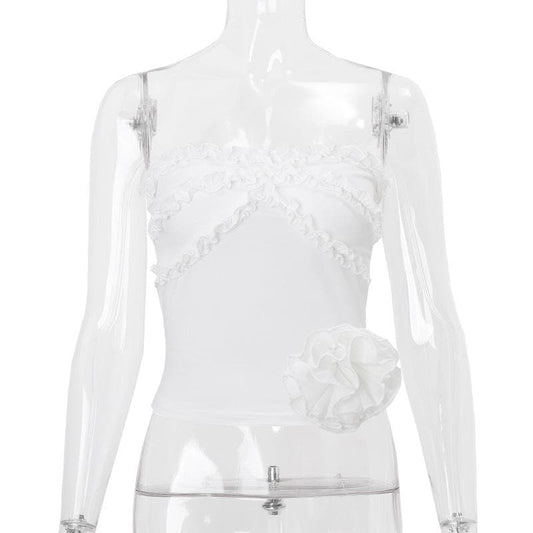 Flower applique ruffle ruched solid tube top